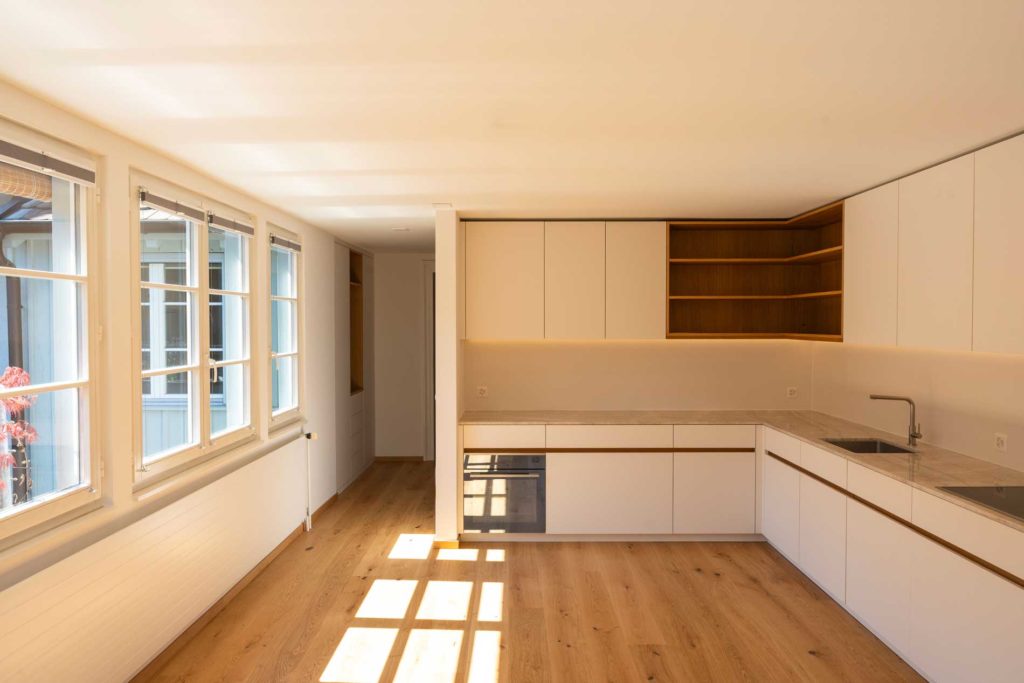 Was gehört zum Innenausbau aus Holz? Möbel, Schränke, Küche, Boden bis hin zur Treppe – zum Innenausbau gehört ein breites Feld an Schreinerei-Arbeiten. Egal, ob bereits Vorstellungen bestehen, oder noch kaum Ideen vorhanden sind, unsere Schreinerei ist bezüglich des Innenausbaus Ihr Ansprechpartner. Von der Idee zur Umsetzung vergeht in der Regel wenig Zeit. Schon bald gehen Sie also durch die neue Holztür, über den neuen Parkettboden, öffnen den Schrank aus Holz und geniessen das Ambiente Ihrer neuen Küche aus Holz.
